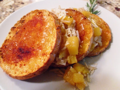 Slice 3 slices of butternut squash from the neck where it is still solid. Either spray with Pam or coat with some olive oil and sprinkle with garlic salt on both sides. Bake at 350F for about 10 minutes ( depending on your ovens strength). Flip the squash and bake for another 5 minutes. Then sprinkle some raw sugar and paprika on the top side of the squash and broil on low for 5 minutes until an nice golden color develops.