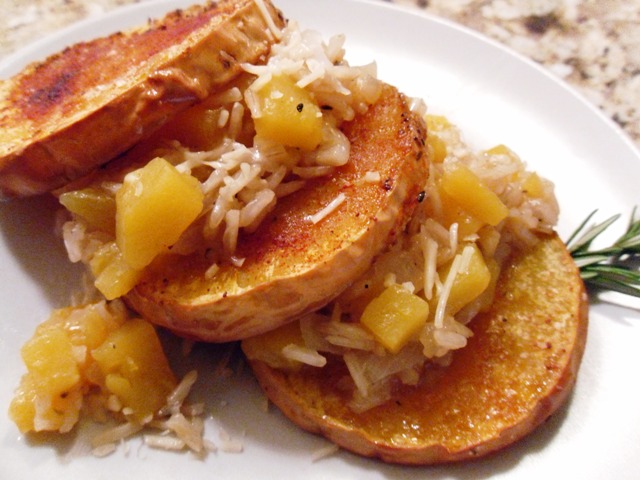 Saute the diced butternut squashed in some olive oil with 1/2 a diced white onion and 2 cloves of garlic. Once the onions become translucent add about 1/8 cup of white wine to deglaze. Then add 1/4 cup of brown jasmine rice and saute for about 1 minute. Finally, add about 1 cup of chicken broth and let it simmer until the rice has cooked. ( It should smell and taste amazing at this point).