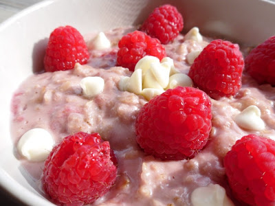 As usual, begin cooking the oats in the milk, water and vanilla. Once it begins to thicken add the brown sugar and cream cheese stirring constantly to ensure it melts evenly. Now add 1/4 cup of the raspberries and allow them to melt giving the oatmeal a dainty pink color. When the oatmeal is done, fold in another 1/4 cup of berries.